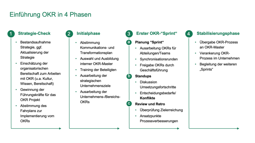 Für mittelständische Unternehmen, die nach einer effektiven Methode zur Verbesserung ihrer strategischen Ausrichtung suchen, bietet OKR eine praxisnahe und erprobte Lösung. Der Erfolg der OKR-Einführung hängt jedoch maßgeblich von einer klaren Planung, einer passenden Unternehmenskultur und der Unterstützung durch die Führungsebene ab.