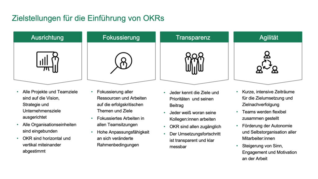 Führungskräfte müssen zudem verstehen, dass OKRs nicht als Kontrollinstrument, sondern als Motivationshilfe eingesetzt werden. Es geht nicht darum, Mitarbeitende zu überwachen, sondern ihnen klar aufzuzeigen, welchen Beitrag sie zum Unternehmenserfolg leisten und wie sie ihre persönlichen Ziele erreichen können.
